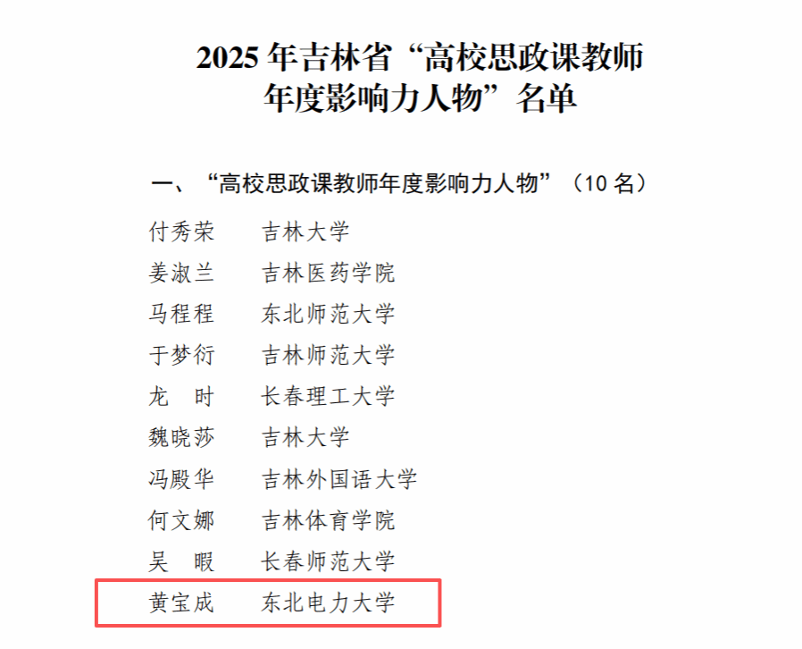 近日,吉林省教育厅公布了2025年吉林省“高校思政课教师年度影响力人物”推选展示活动评选结果。经学校推荐、专家评审,评选出吉林省“高校思政课教师年度影响力人物”10人、“高校思政课教师年度影响力人物提名”60人。我校马克思主义学院教师黄宝成获评2025年吉林省“高校思政课教师年度影响力人物”,陶美庆入选2025年吉林省“高校思政课教师年度影响力人物提名”。
